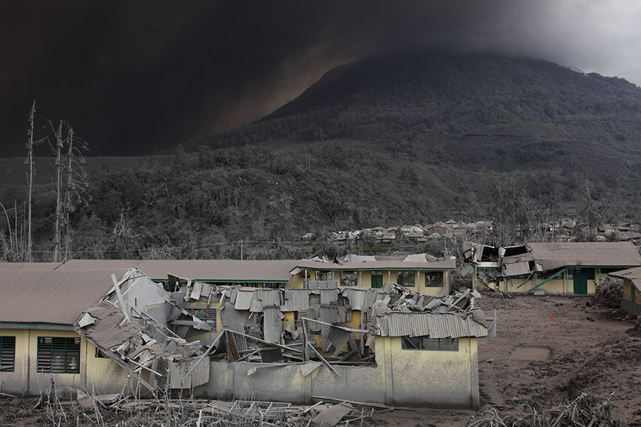 Partial roof collapse of a school in a village which has experienced heavy ashfall from Sinabung volcano, Indonesia, January 2014.