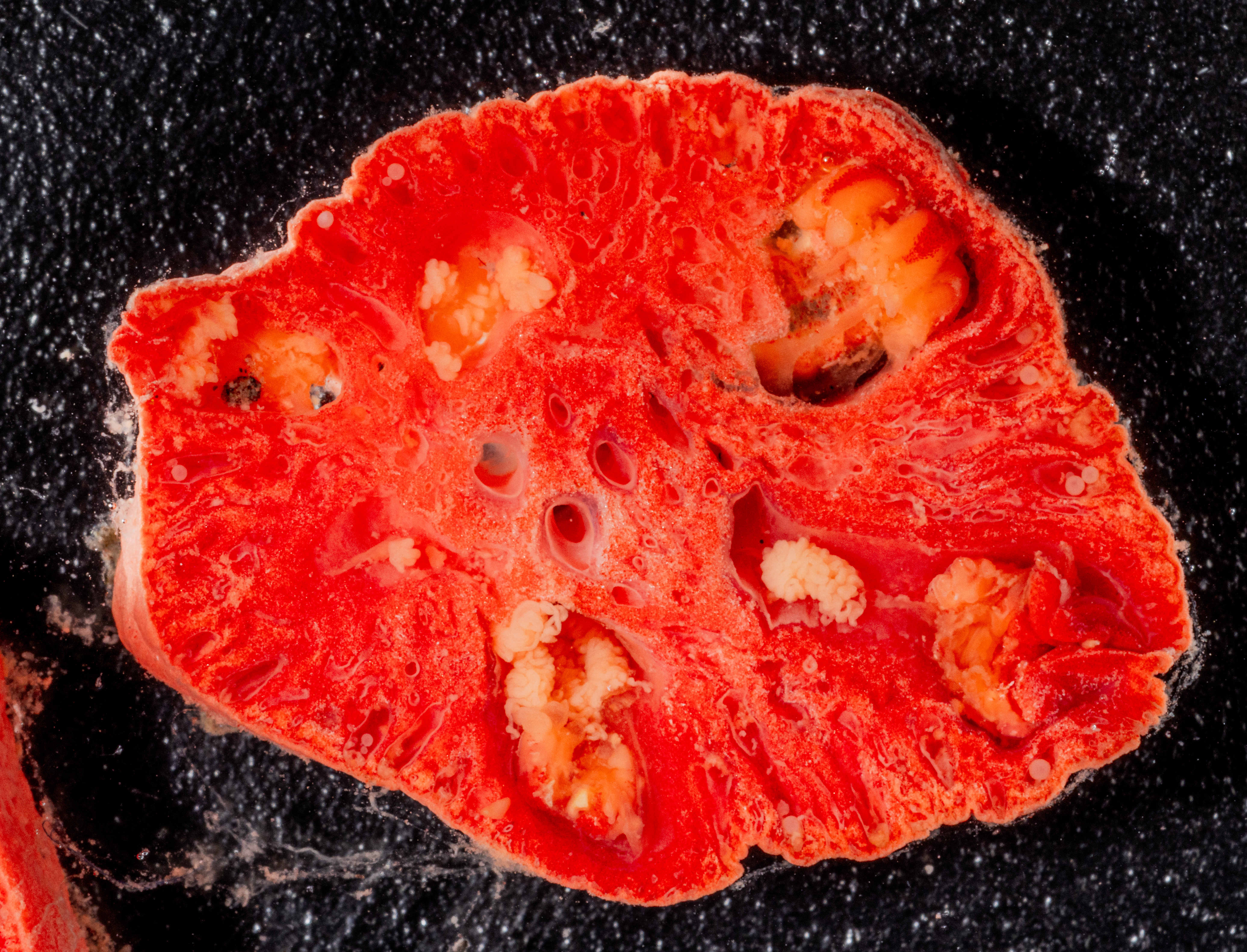 This is a slice of Bubblegum coral taken from AL5322 during the Aleutian Arc Expedition. If you look closely at the edges you can see little pockets of eggs (white spheres) showing us that this coral is a female.
