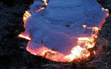 Thin, slowly advancing pahoehoe lobe in western arm of Mother's Day flow below Paliuli, 0555. Note the small grass fire at the margin of the lobe.