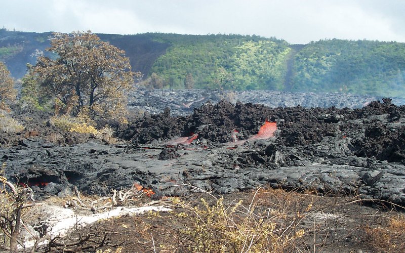 Sluggish lava flow spreads from the base of the Pūlama pali (background), burning vegetation sandwiched between flows emplaced in 1985 and 1992. As new lava continued to feed the leading edge of flow, the trailing surface inflated by several meters.