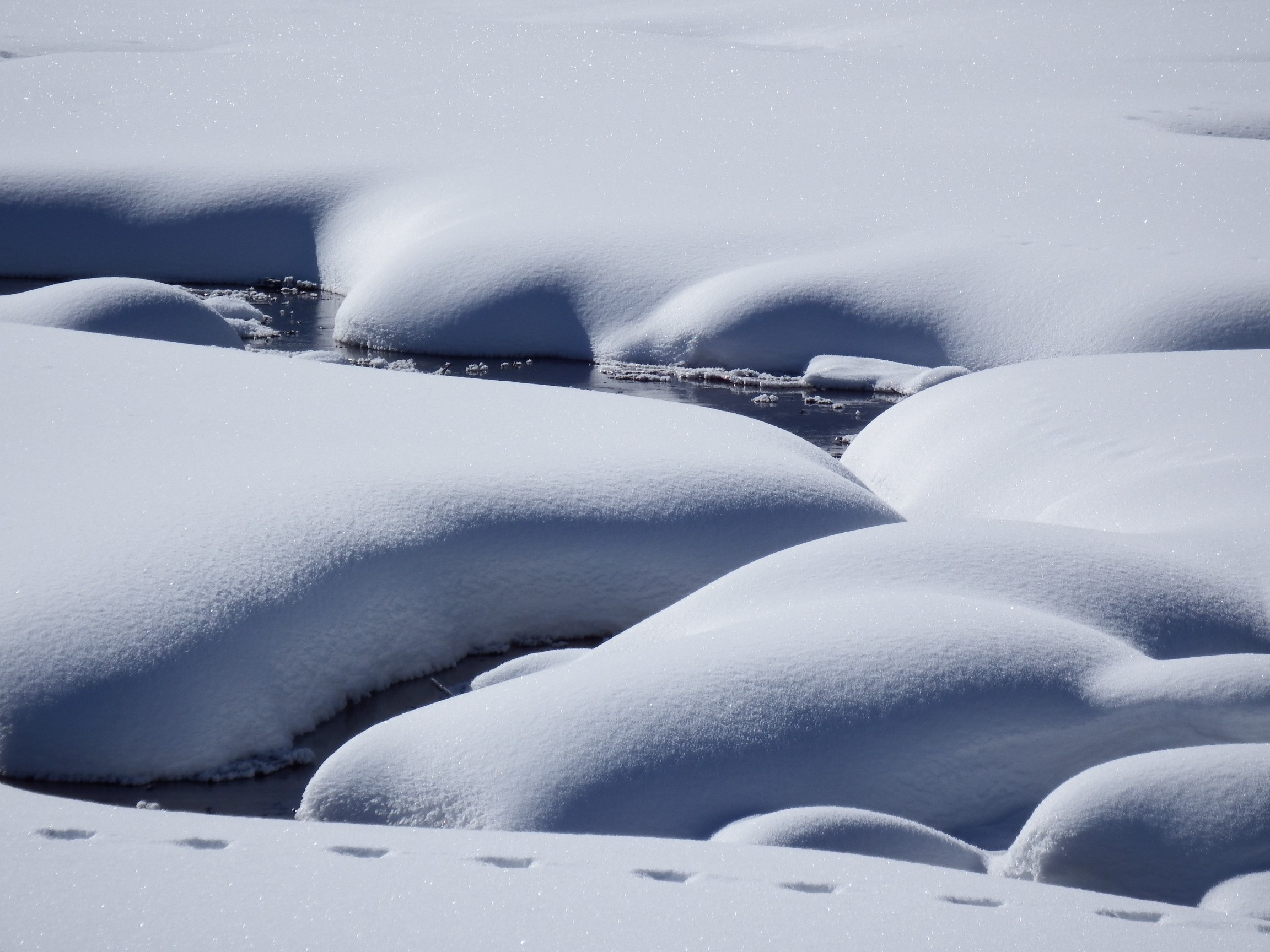 The image shows a small stream winding through snowbanks. The image was taken in Montana.