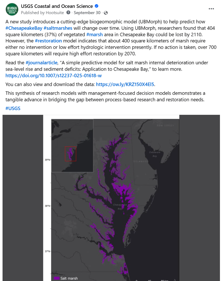 A new study introduces a cutting-edge biogeomorphic model (UBMorph) to help predict how #ChesapeakeBay #saltmarshes will change over time. Using UBMorph, researchers found that 404 square kilometers (37%) of vegetated #marsh area in Chesapeake Bay could be lost by 2110. However, the #restoration model indicates that about 400 square kilometers of marsh require either no intervention or low effort hydrologic intervention presently. If no action is taken, over 700 square kilometers will require high effort restoration by 2070.