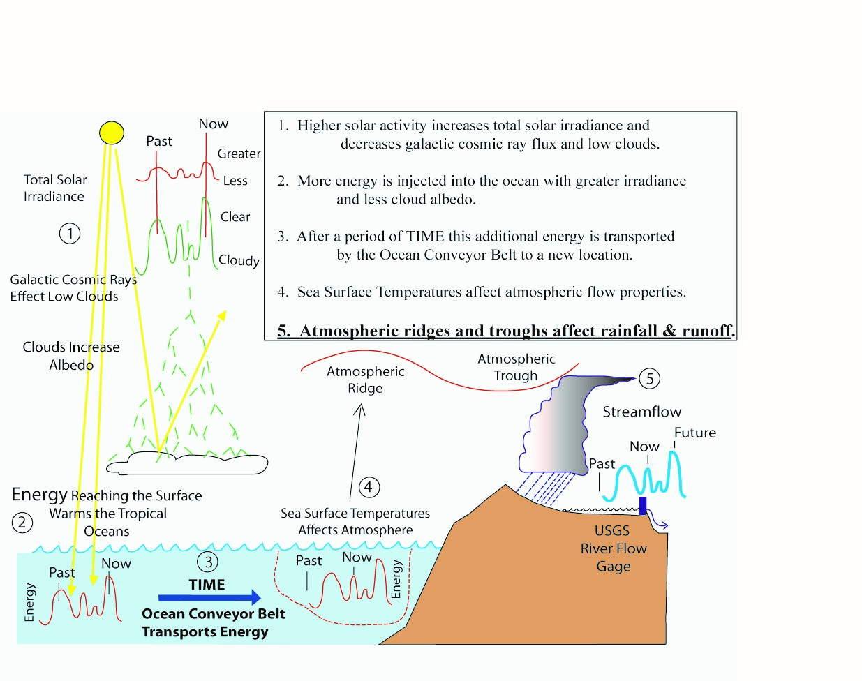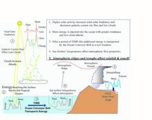 This diagram shows solar irradiance effects the ocean and low clouds resulting in atmosphereic ridges and troughs affecting rainfall and runoff.