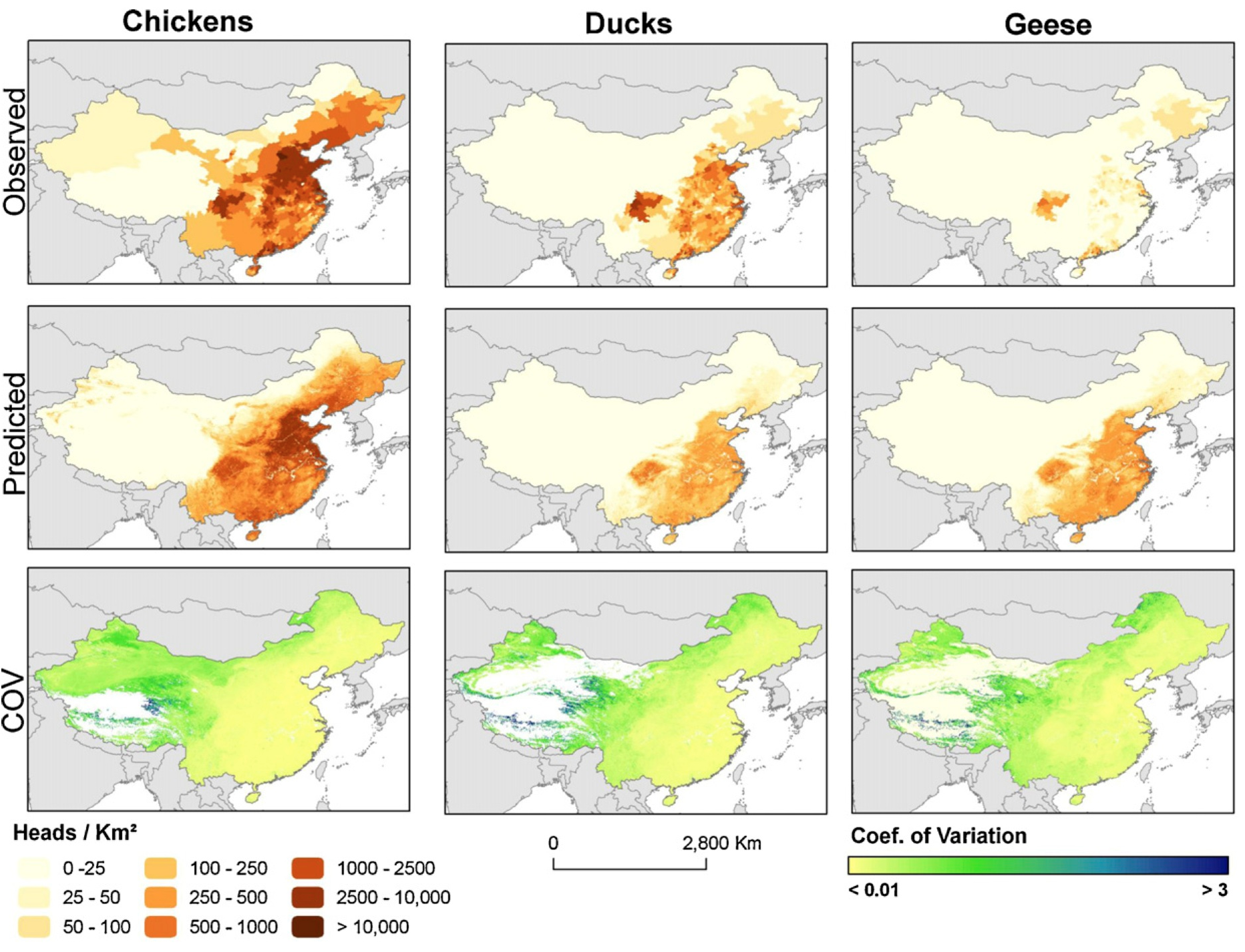 1 km resolution Poultry distribution models showing the distribution of domestic chickens, ducks, and geese in China (Prosser et al. 2011, Agriculture, Ecosystems, and Environment).