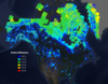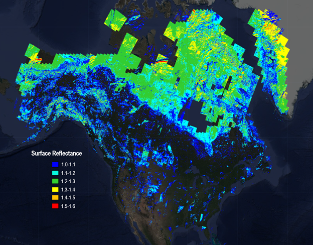 This map displays the spatial distribution of the Landsat 8 and 9 Collection 2 Surface Reflectance Band 4 (Red) values > 1.0 from March 2022 over North America. The inappropriate AOT retrieval over snow/ice cover and the relatively high Solar Zenith Angle (SZA>60 degrees) in higher latitudes in March are primary reasons for extensive SR >1.0.