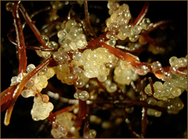 Naturally-deposited herring eggs attached to submerged macrophytes. Coiled embryos are evident inside the eggs.