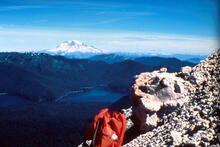 Spirit Lake and Mount Rainier viewed from Sugar Bowl in 1974, Mount...