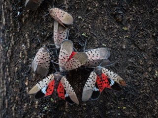 This image shows numerous Spotted Lanternflies. The Lanternflies have black spots on top of their red and white wings. These insects can jump great lengths making them extremely hard to kill. Photo courtesy National Park Service.