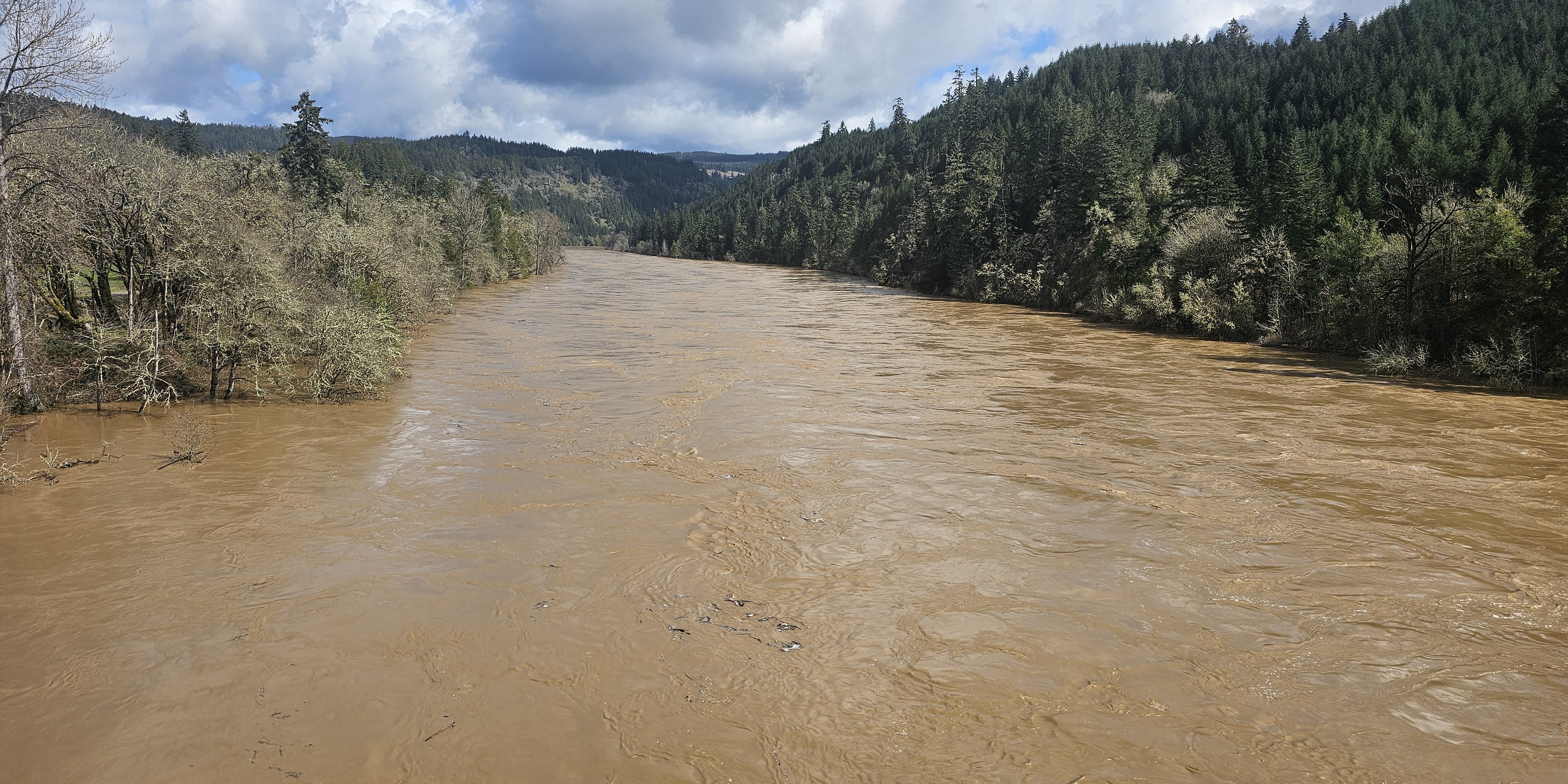 A USGS hydrologic technician captured this photo of the Umpqua River near Elkton, Oregon, during a high-flow measurement—the third-highest flow recorded at this gage since it began operation in 1905. View gage data.