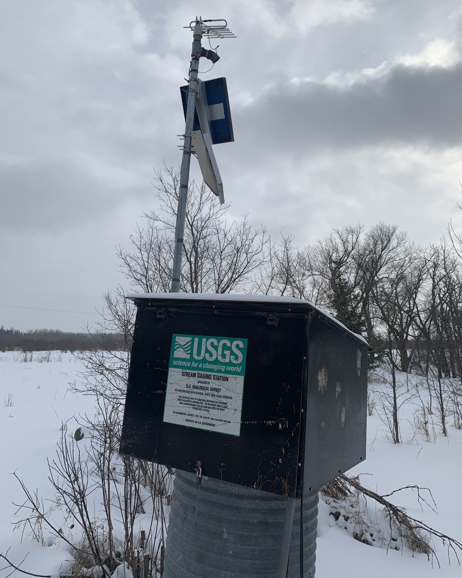 USGS streamgage housing with solar panel and sensors mounted on a pole, against a snow-covered rural background under a cloudy sky.