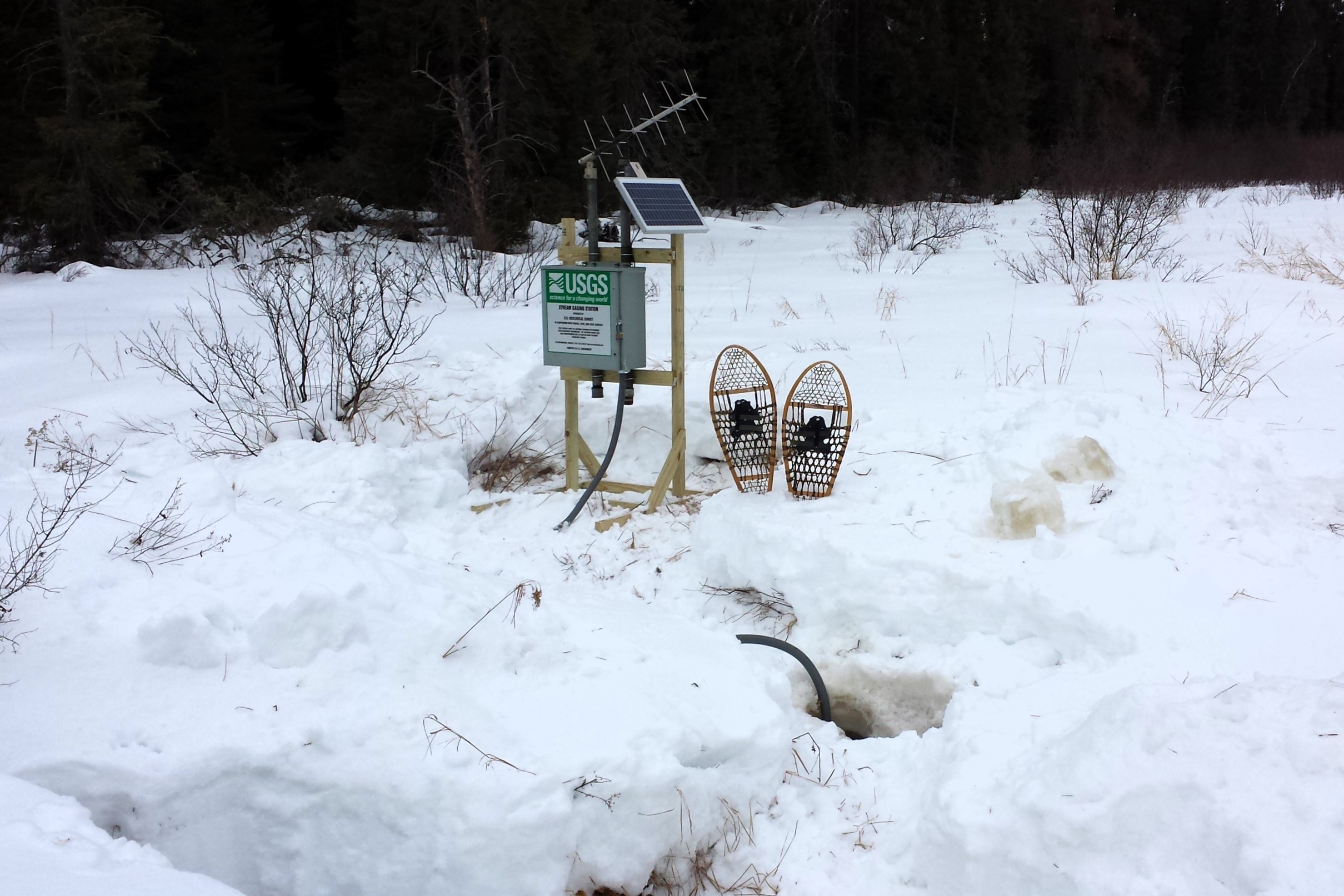 A pair of snowshoes rests in the snow next to a small streamgage mounted on a wooden frame, with antenna and solar panel. A black tube connected to the gage enters a hole in the snow in the foreground.