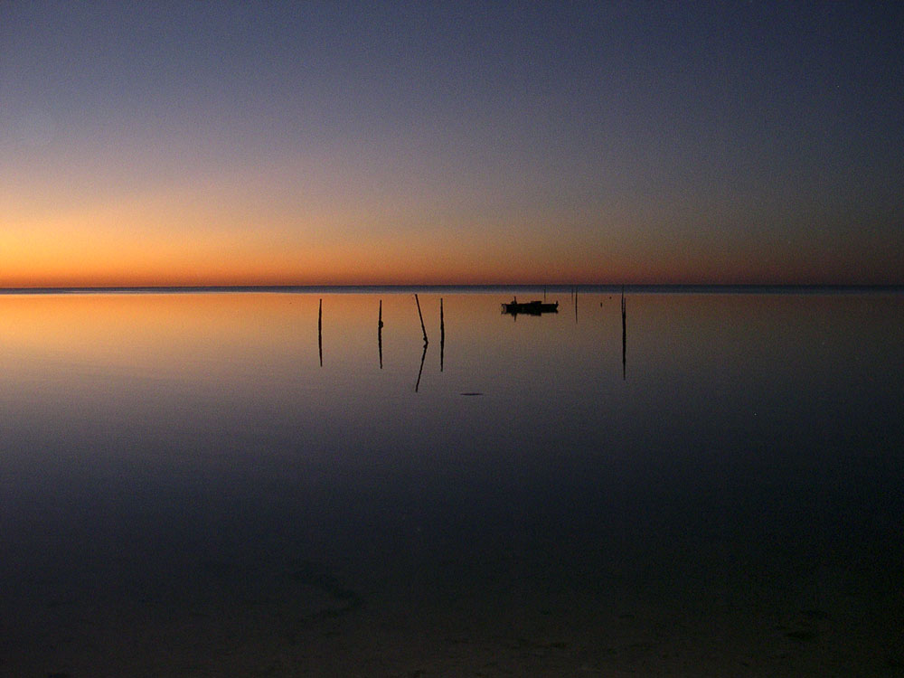 A submarine-ground-water-discharge site at Florida State University's Marine Lab. The small boat was used as a platform for thermal-seepage-meter data loggers, as well as for an instrument making time-series measurements of the most stable isotope of Radon, 222Rn. Also visible are well casings from a series of shallow wells that extend offshore along a shore-perpendicular transect.