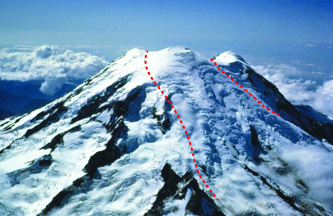 Summit of Mount Rainier viewed toward the SW. The dashed red lines...