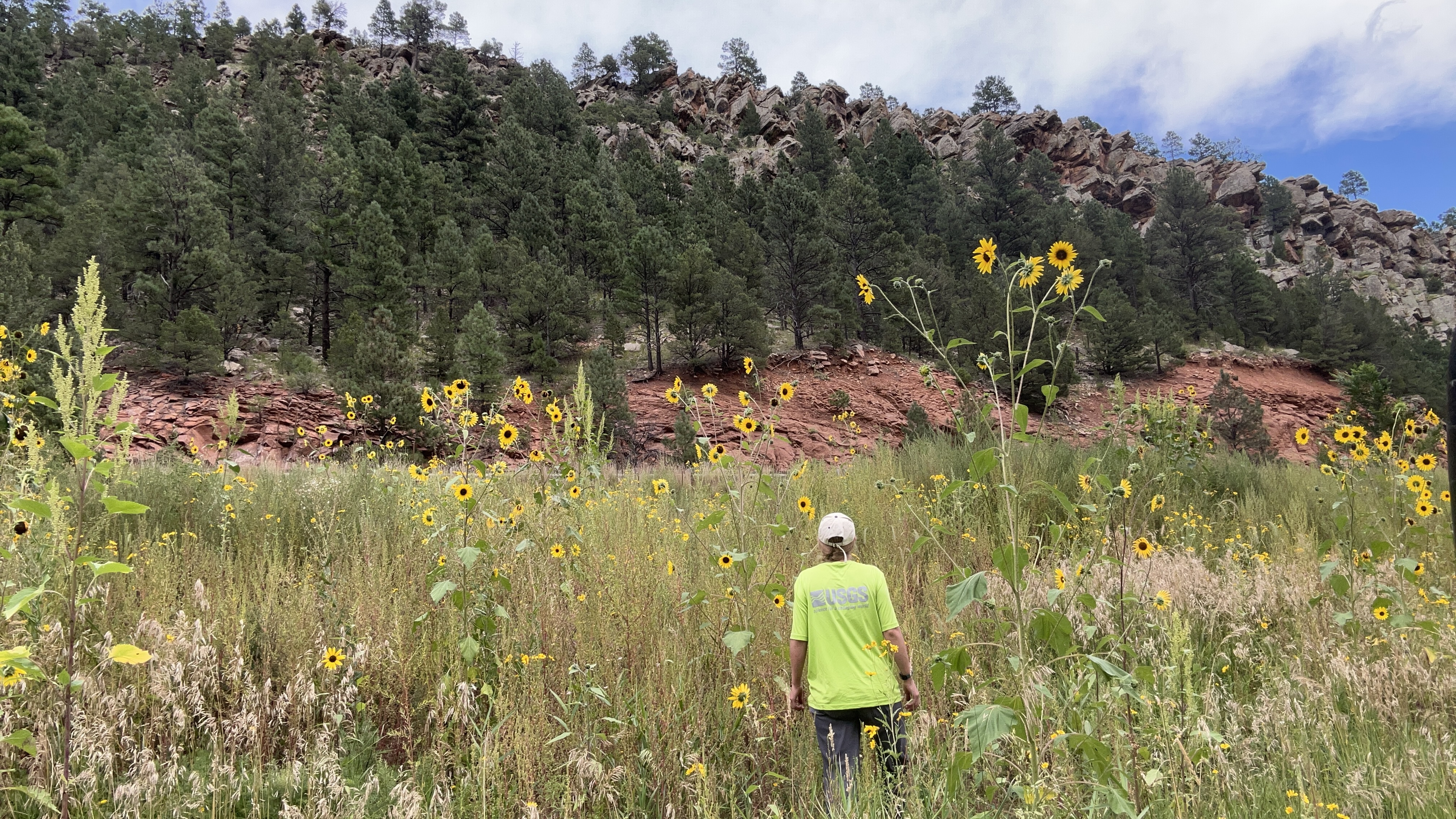 One of our scientists walks through a field of sunflowers to access one of our streamgaging sites on Mora River in La Cueva, NM.