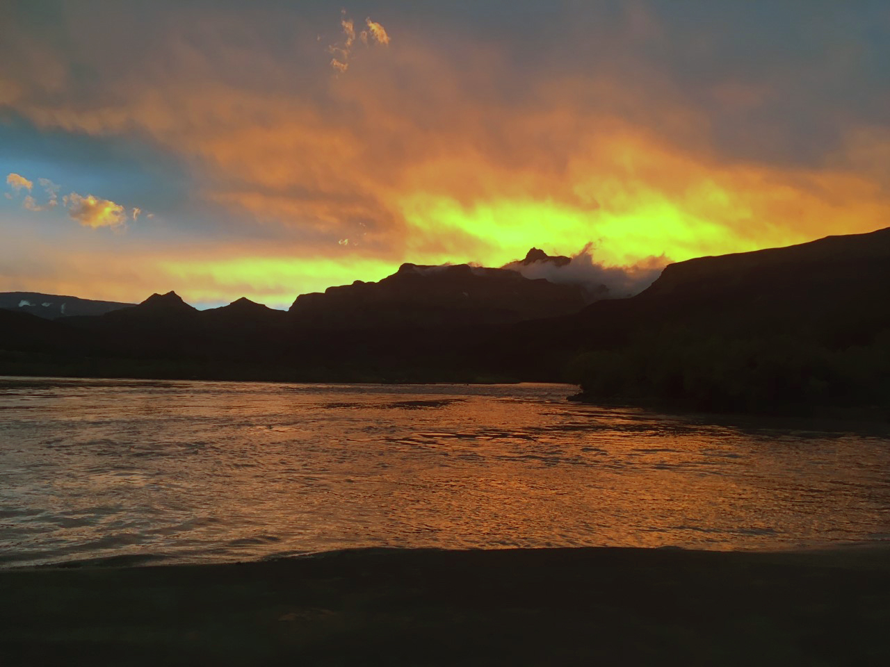 A bright sunset reflects orange light on the Colorado River in Grand Canyon, at Basalt Camp. Photo by Emily Palmquist, USGS.