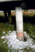 Support column of bridge across Struve Slough, Highway 1. Enlargement of hole where support enters the ground is an effect of lateral shaking, which caused the concrete to break up where the column joined the bridge and was instrumental in the roadbed collapse.