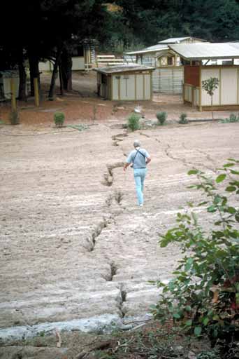 A geologist traces surface cracks in a corral adjacent to summit road approximately 1.6 km (1 mi) southeast of Highway 17.
