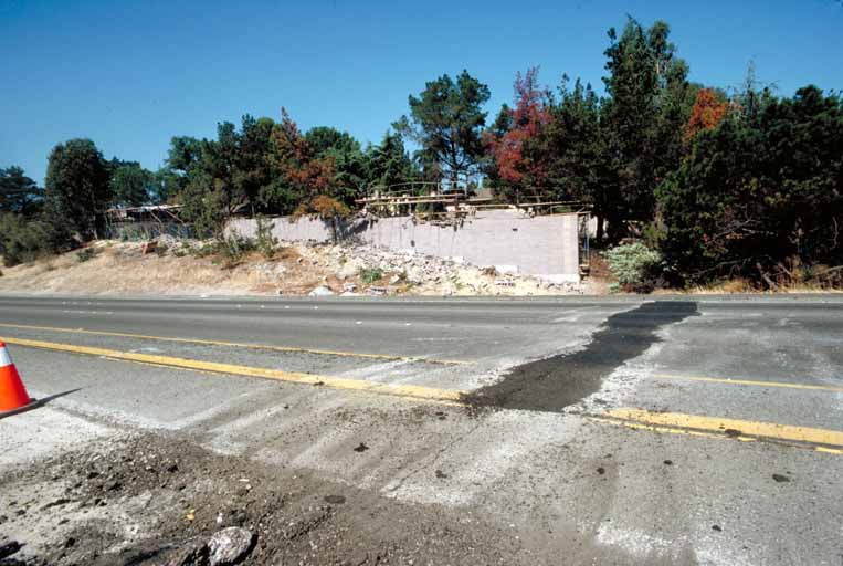 Nontectonic surface rupture across Highway 280 at the interface of a roadcut and fill area 2.5 km (1.5 mi) north of Foothill Expressway.