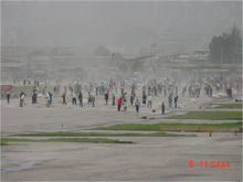 Dozens of workers sweep the runway at Quito's International Airport that was covered with ash from the 3 November 2002 eruption of Reventador Volcano, located ~60 miles to the east of the Ecuadorean capital. The airport was closed for 8 days while clean up took place.