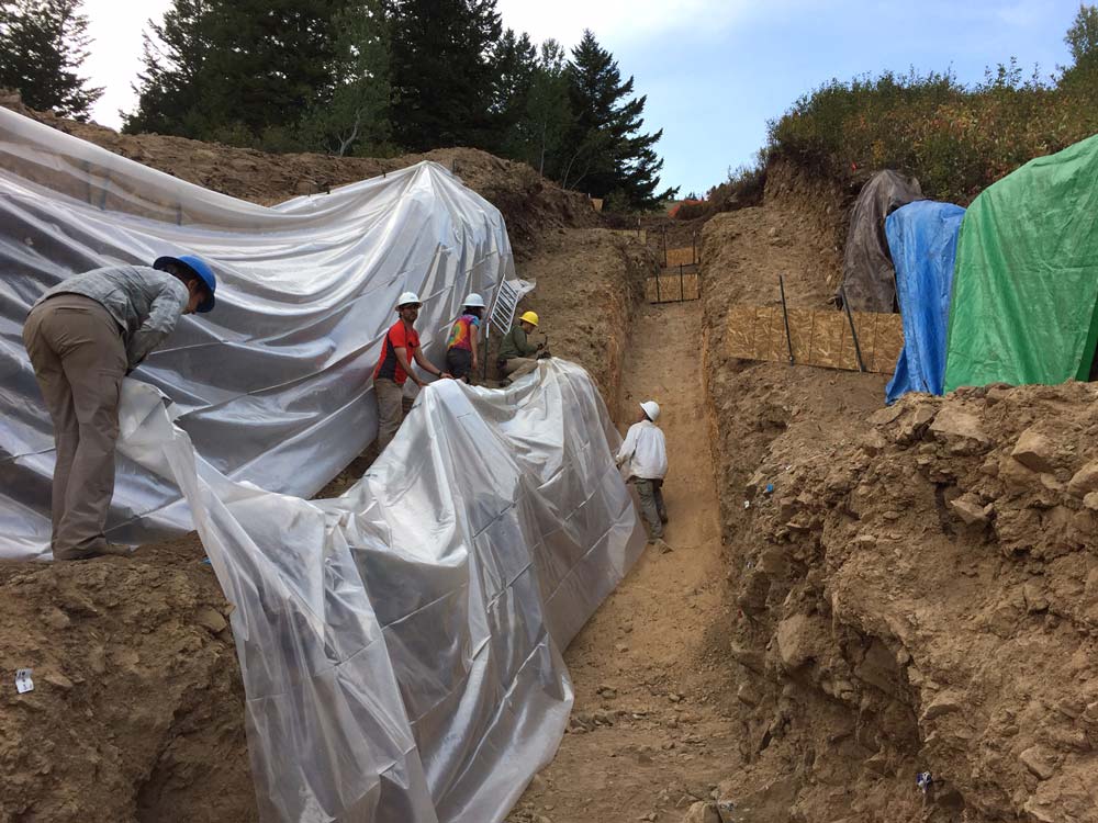 Jaime, Rich, Nicole, Ryan, and Dean set up plastic sheets and tarps to protect the critical part of the trench in case of rain.