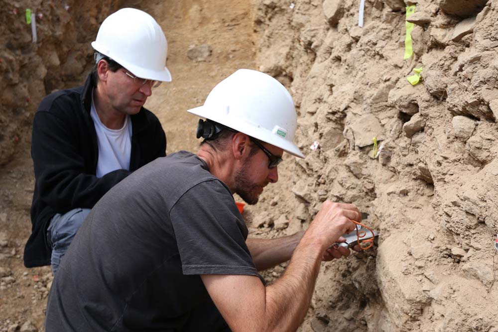 Chris and Ralph take a sample of charcoal for radiocarbon dating.
