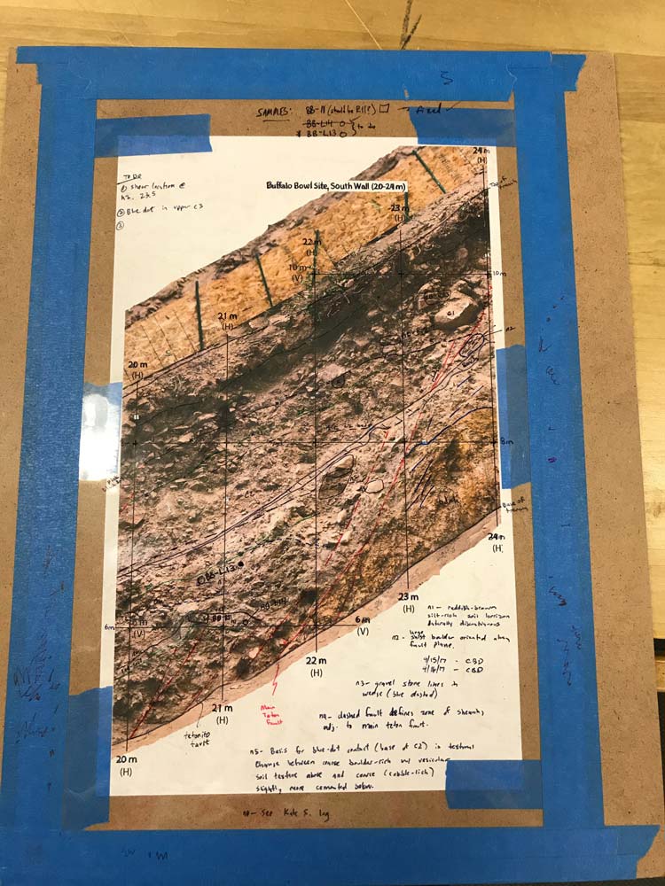 This is a piece of the trench photomosaic with clear dura-lar plastic on top and notes from logging. We log things like contacts between units, faults, internal stratigraphy, sample locations, and other details. For example, the red lines in this log are faults! It's not uncommon to see more than one fault splay at the surface. At depth, they all generally merge into one fault plane.