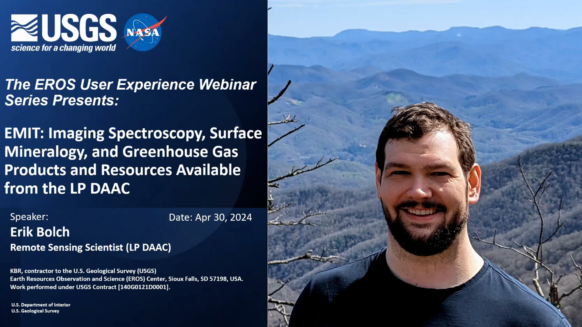 Thumbnail image of the webinar EMIT: Imaging Spectroscopy, Surface Mineralogy, and Greenhouse Gas Products and Resources Available from the LP DAAC, which is located at the USGS Earth Resources Observation and Science (EROS) Center.