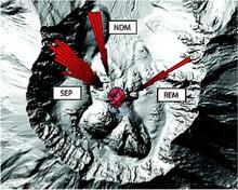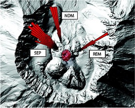 Rose plots of hand-picked tilt azimuths. Azimuths converge near the south end of the 1980s lava dome. Red oval shows approximate location of 1980 conduit, estimated from the location of a welt which grew on the crater floor following the 1980 eruption and was later buried by a series of lava domes. Black cross shows the location of the center of the radial coordinate system. Background shaded relief map is from February 2006.