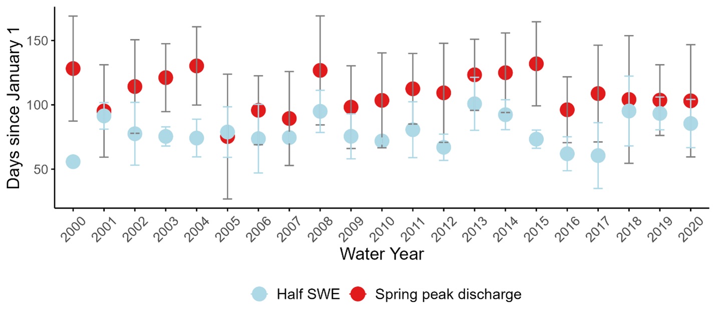 Time series of mean calendar day (standard error represented by whiskers) when gages recorded the peak springtime discharge (red) and when snowpack melted to half its maximum recorded Snow Water Equivalent (half SWE; light blue). The considerable variability between timing of snowmelt and spring discharge suggests the timing of snowmelt may not be the primary determinant of when peak discharge occurs.