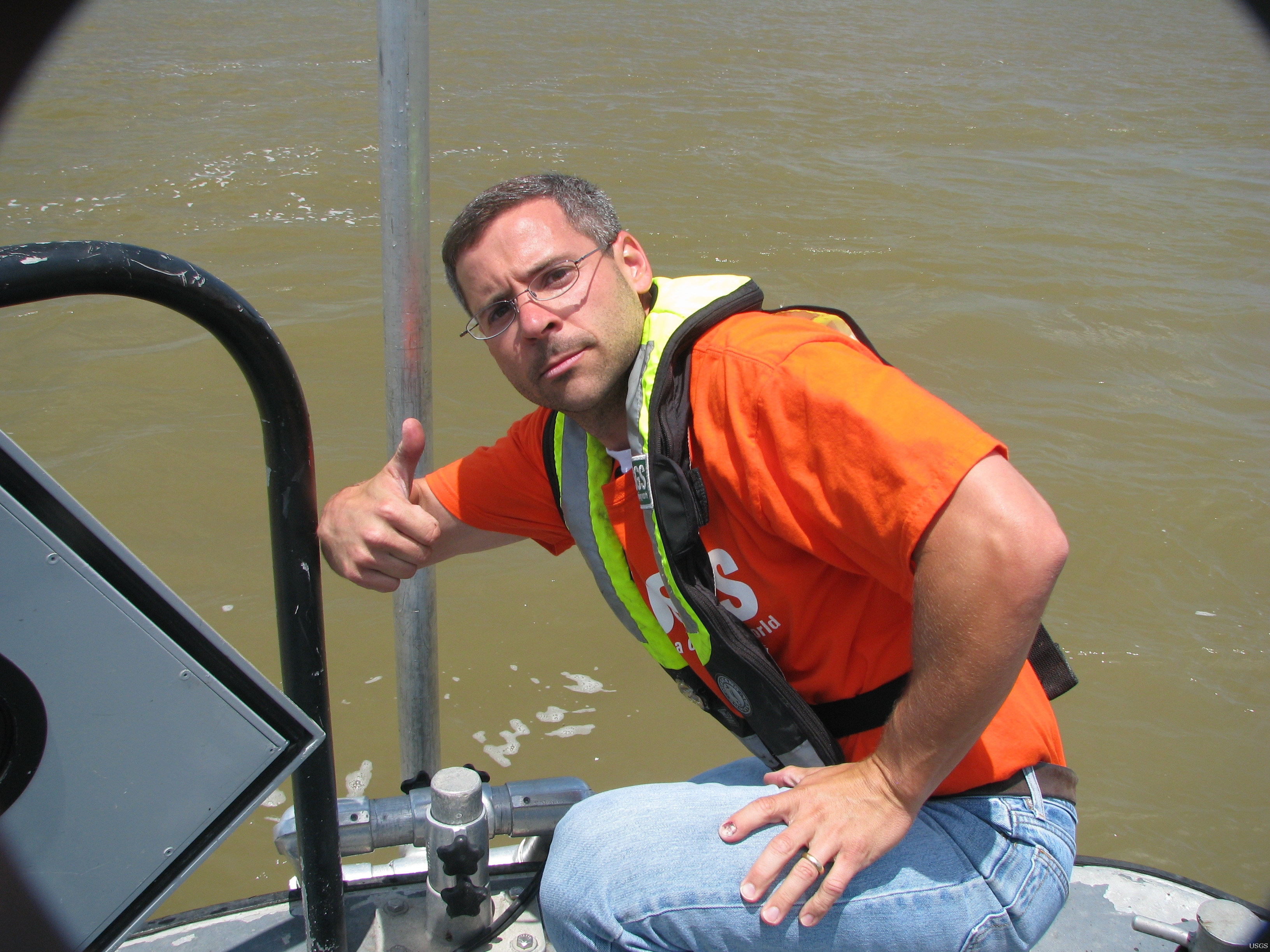 USGS hydrologist Todd Baumann gives a thumbs up after setting the Acoustic Doppler Current Profiler (ADCP) aboard the Butta Bean during the 2011 Flood. USGS uses the ADCP to make streamflow measurements. The ADCP emits soundwaves through the water column, which rebound off particles in the water until they reach the river bottom. The ADCP reads these reflected soundwaves to determine the speed and the depth of the water, which together yield the streamflow of the river. At the height of the flood, USGS crews are out every other day taking streamflow measurements to ensure the US Army Corps of Engineers has accurate, up-to-date information with which to base its river management decisions.