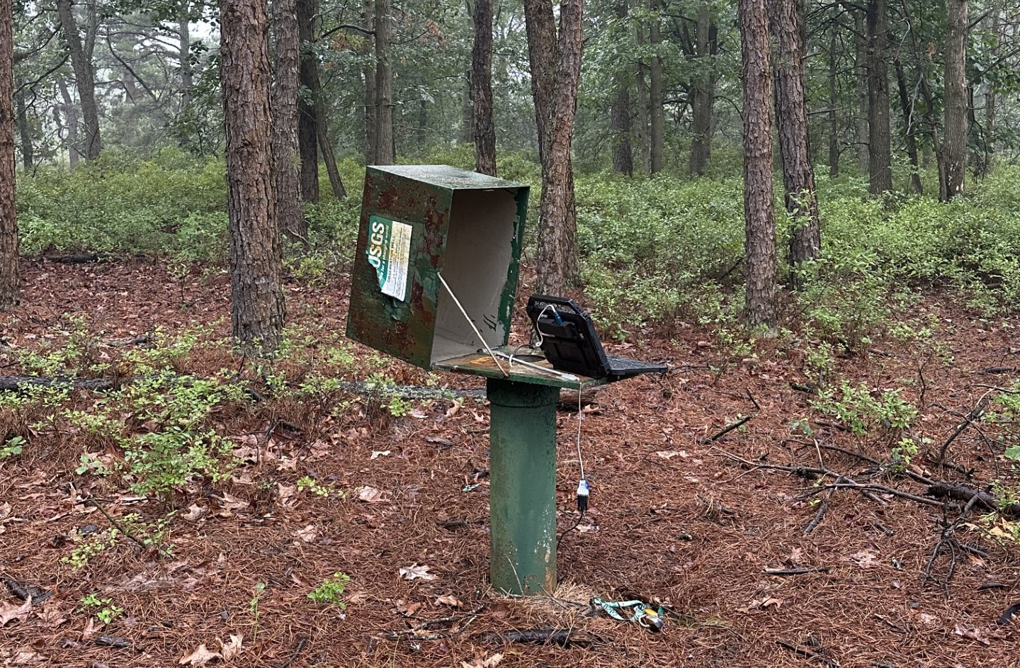 A field computer connected to the water level probe in the Tom's River 84 Obs well to download the data collected since the last inspection.