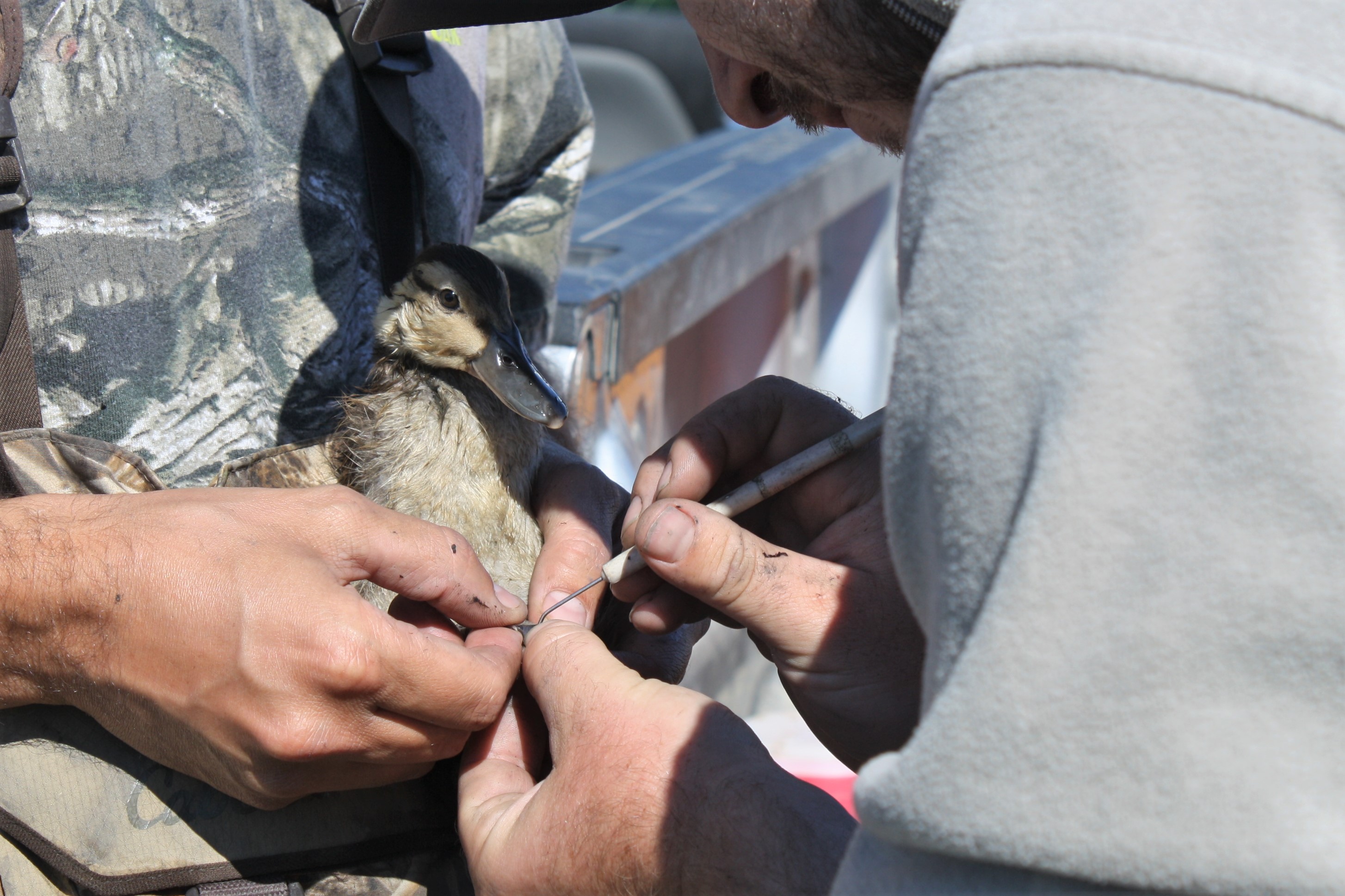 Ducklings are fitted with a tag on the webbing of their foot as opposed to a band on the leg. Scientists use the pictured tool to poke a hole in the webbing between the toes and secure the tag with a special clamp.