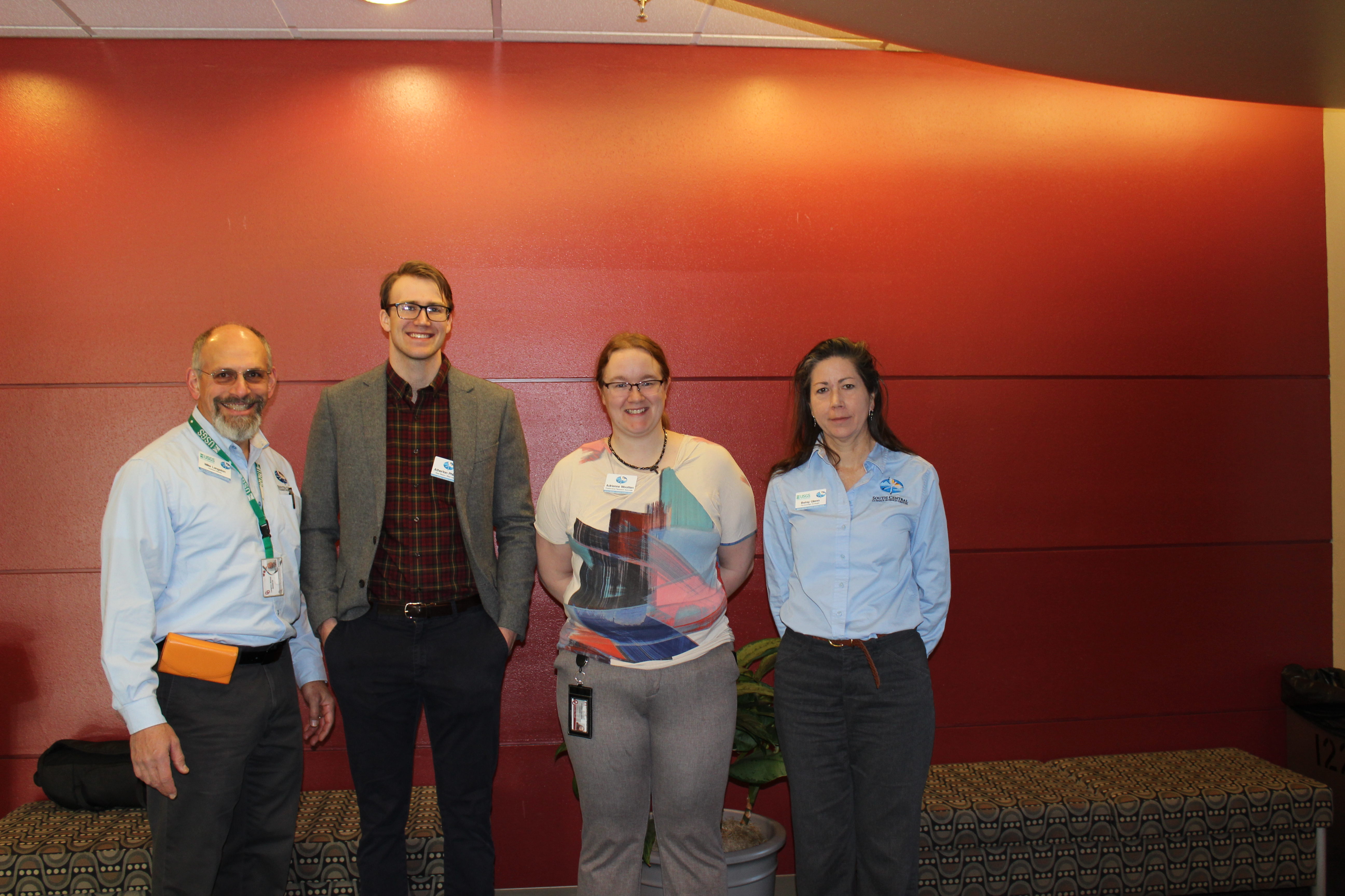A group photo from the New Mexico Tribal Resiliency Workshop. From left to right: Mike Langston, South Central CASC Acting Director; Atherton Phleger, Tribal Liaison; Adrienne Wootten, Climate Scientist; and Betsy Glenn, Partnerships Ecologist.