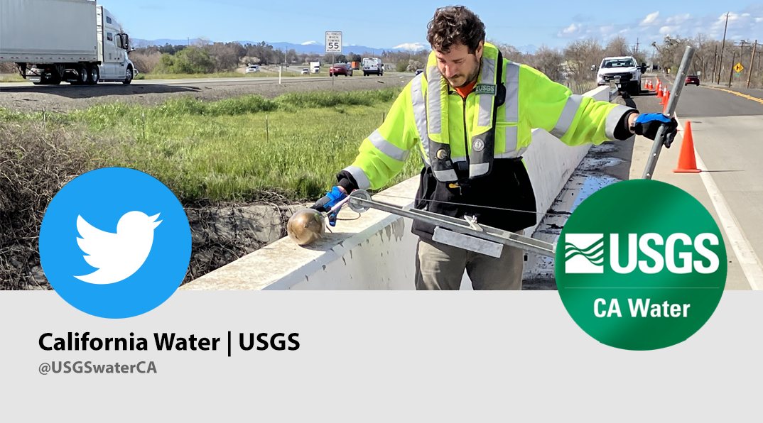 Info block image showing hydrotech taking measurements on Cache Creek, near Yolo, CA.