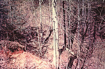 Two-foot scarp on downstream side of Kelly Barnes Dam, in lower left portion of picture.