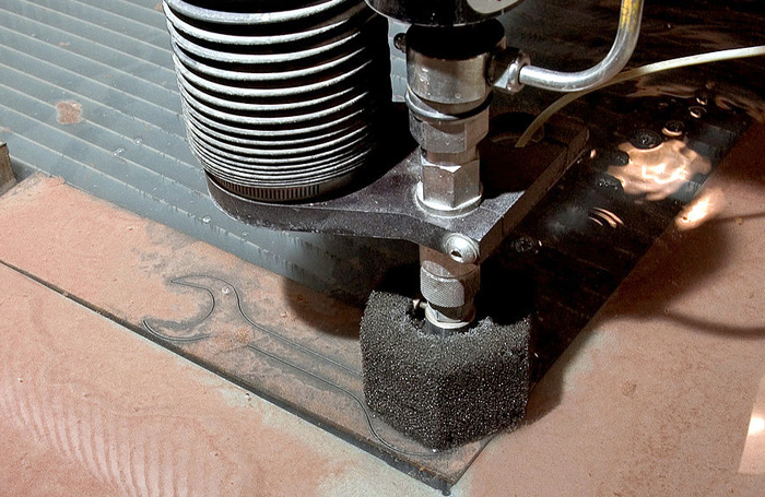 An abrasive water-jet cutter puts the final cuts on a special tool that is being created by Airmen assigned to the 3rd Equipment Maintenance Squadron metals technology shop at Elmendorf Air Force Base, Alaska.