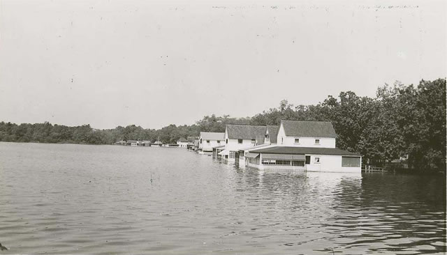 Fllod waters from Union Lake engulphing houses along the shoreline.