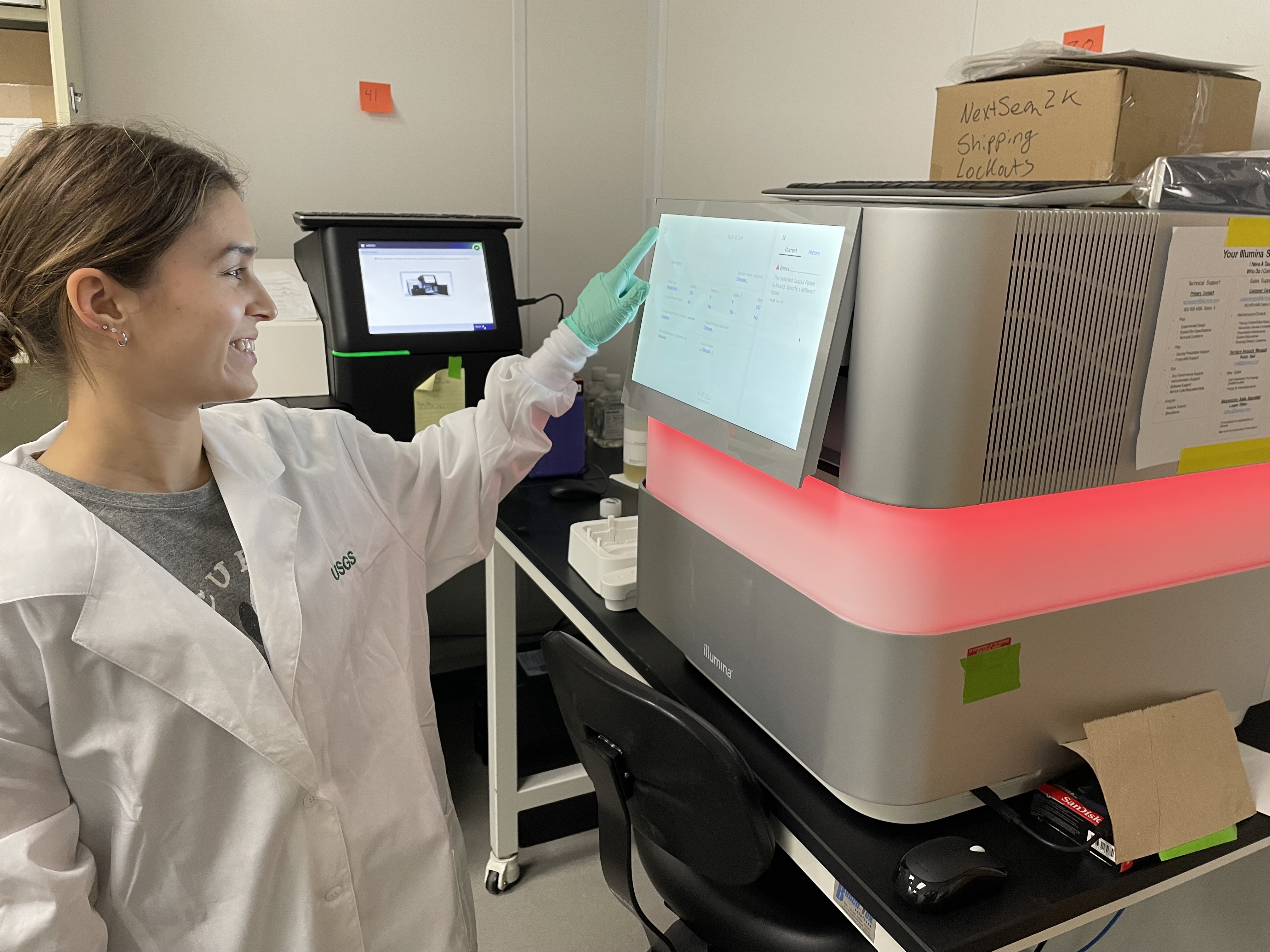 A USGS molecular biologist is reviewing the details of a completed high-throughput sequencing run. This method can simultaneous sequence hundreds of millions of RNA molecules isolated from invasive carp tissue samples.