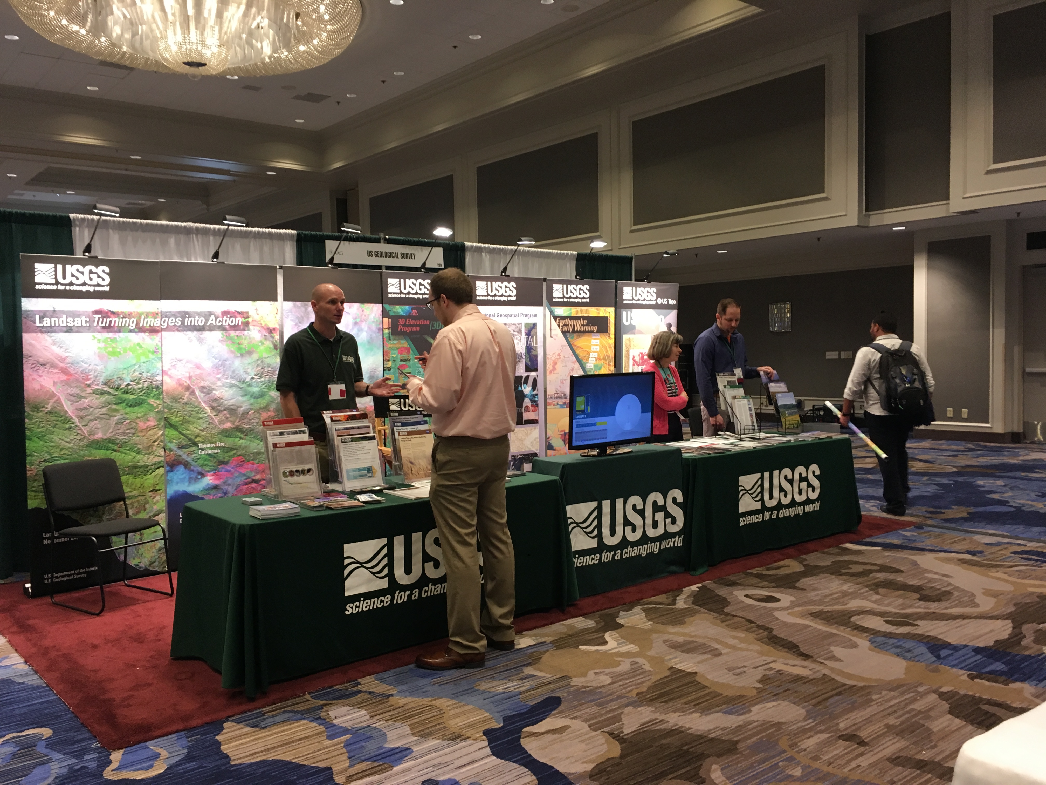 Photo of Chris Cretini, Gita Urban-Mathieux, Travis Smith working at the USGS booth during the 2018 AAG Annual Meeting