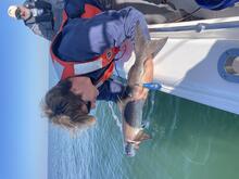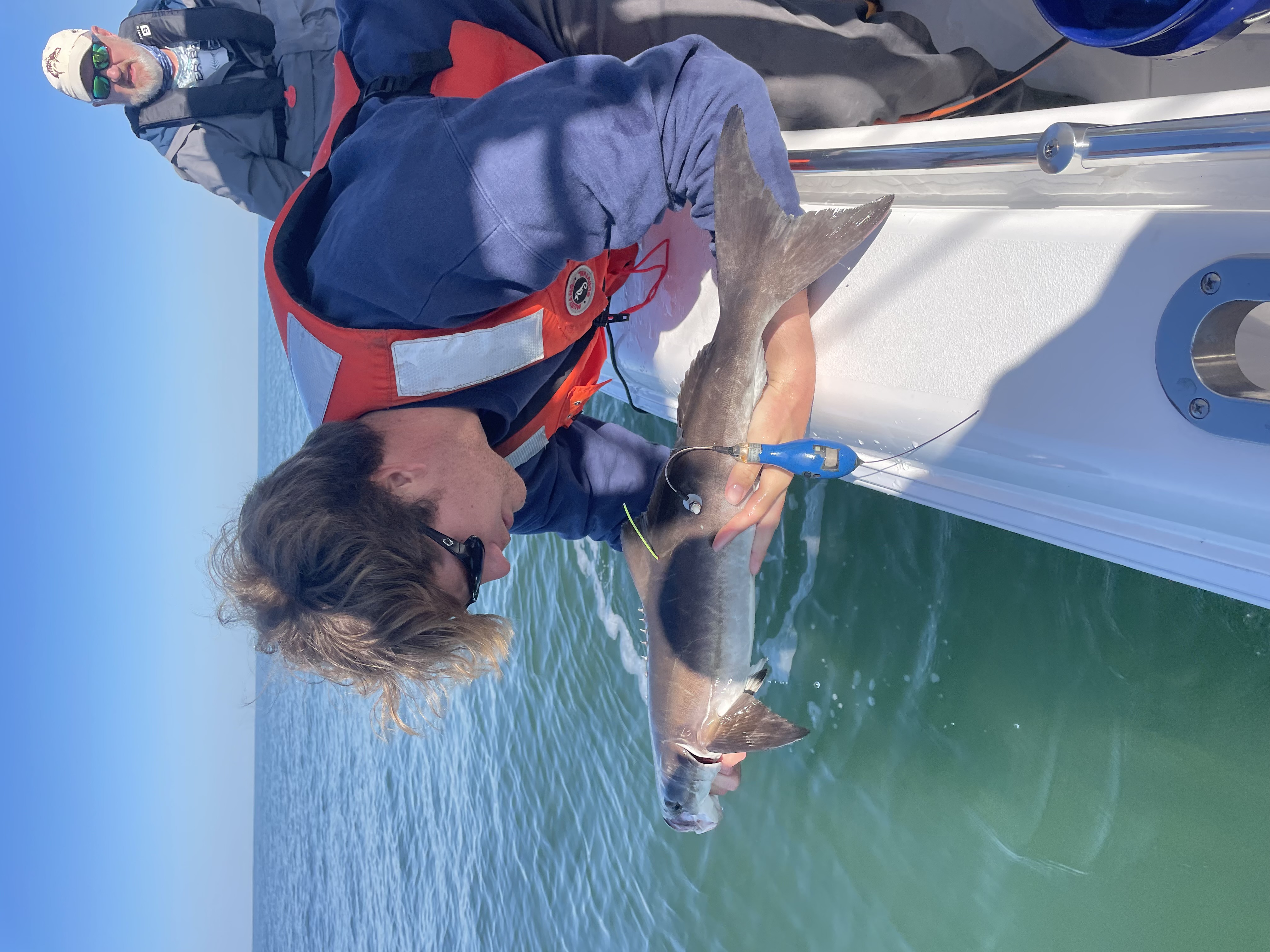 USGS biologist Joseph Alday holds a tagged cobia as part of a research project tagging sport fish for the Gulf States Marine Fisheries Commission off the Florida Panhandle