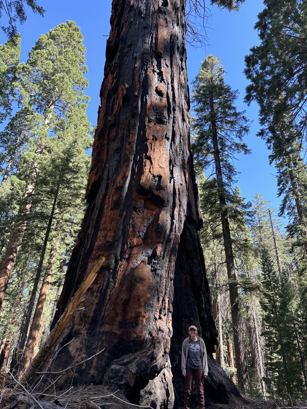 Hazel Mebius stands in front of a burned but live sequoia in Sequoia National Park. Mebius was taking part in a summer-long internship with USGS Earth Resources Observation and Science (EROS) Fire Science, studying fire severity and comparing traditional field measurements with lidar scans. She will continue to work part time analyzing the data collected through the school year.