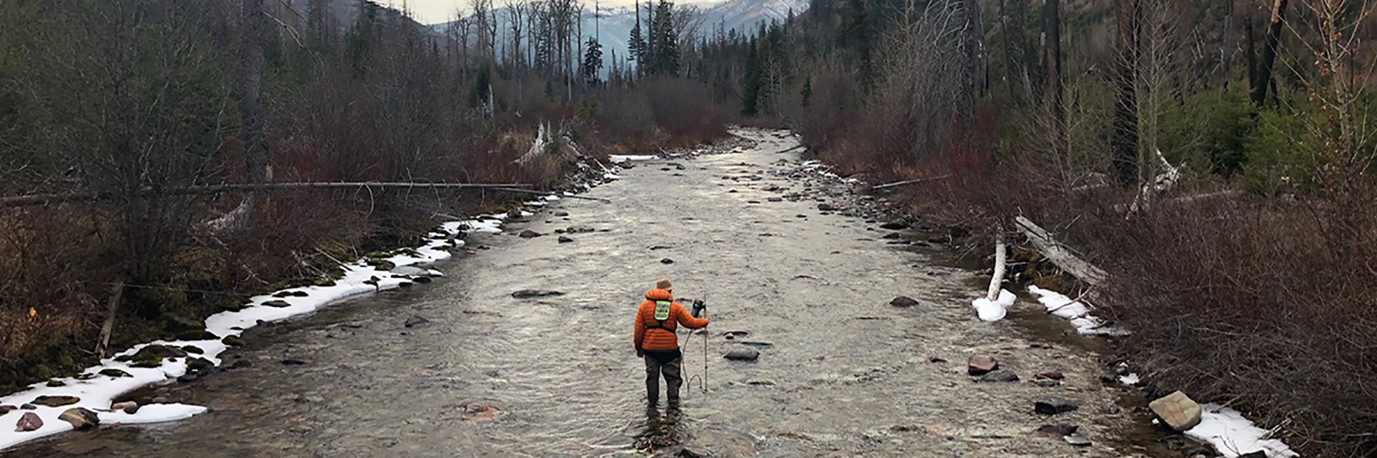 USGS hydrographer measuring streamflow on Big Creek near Apgar, MT