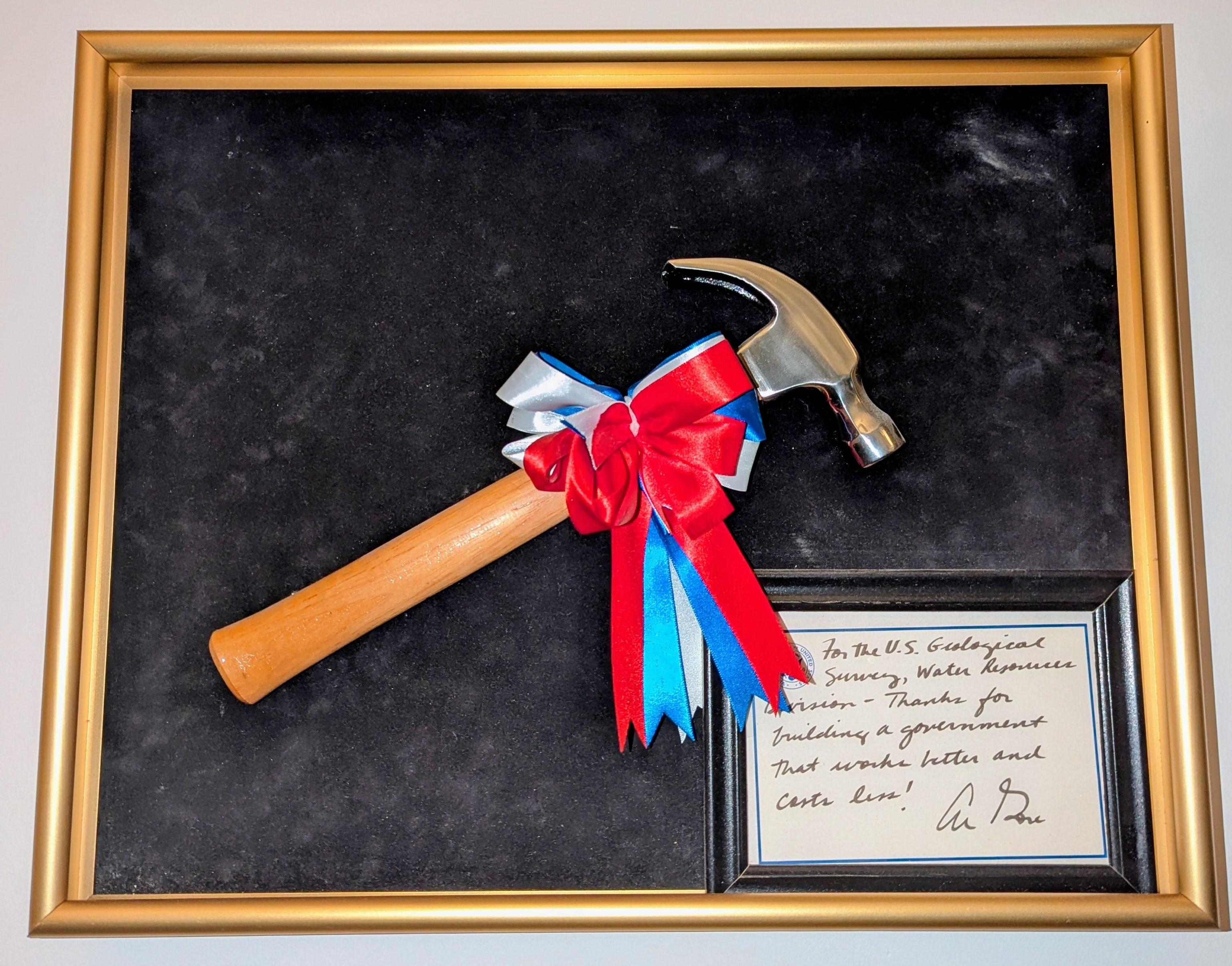 In 1996 the USGS Water Resources Division (now called Water Mission Area) received Vice President Gore's Hammer Award. It was presented by Assistant Secretary for Water and Science, Patricia Beneke, at the Carnegie Center in Oregon City, Oregon, with Dennis Lynch, District Chief, Oregon, accepting on behalf of the Division. Assistant Secretary Beneke observed firsthand the great work of the Oregon District staff in providing real-time data during the catastrophic floods in the Pacific Northwest in February 1996, so it was fitting that she presented it there. The award is in recognition of the extraordinary efforts that have been made throughout the Division to improve the USGS early warning system for flood hazards.