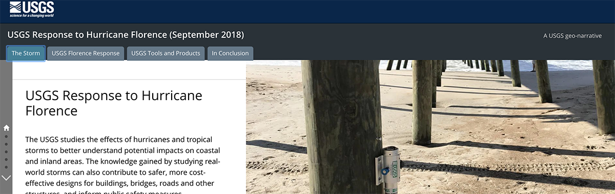 A screenshot of a new USGS webpage that highlights the USGS' many efforts to collect scientific data from Florence. For more information, vist https://wim.usgs.gov/geonarrative/florence_response/.