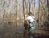USGS scientist sampling sediments for organotin analysis in a beaver pond on Red Bank Creek, Lexington County, South Carolina. The pond is downstream of the spill site.