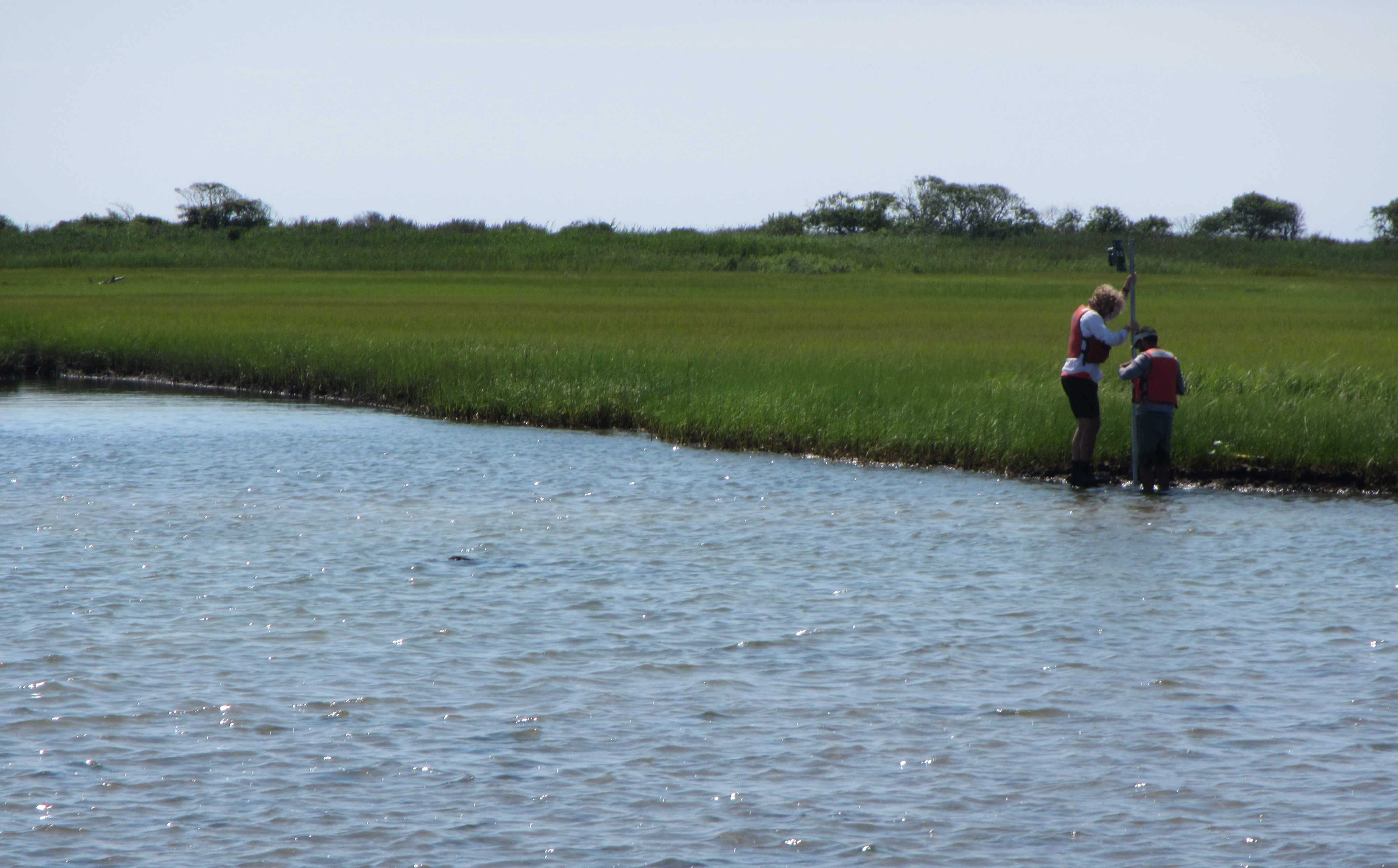 WHCMSC scientists Neil Ganju (right) and Dan Nowacki (left) install a camera in the back-barrier marsh to monitor marsh-edge erosion along the northern shoreline of Fire Island