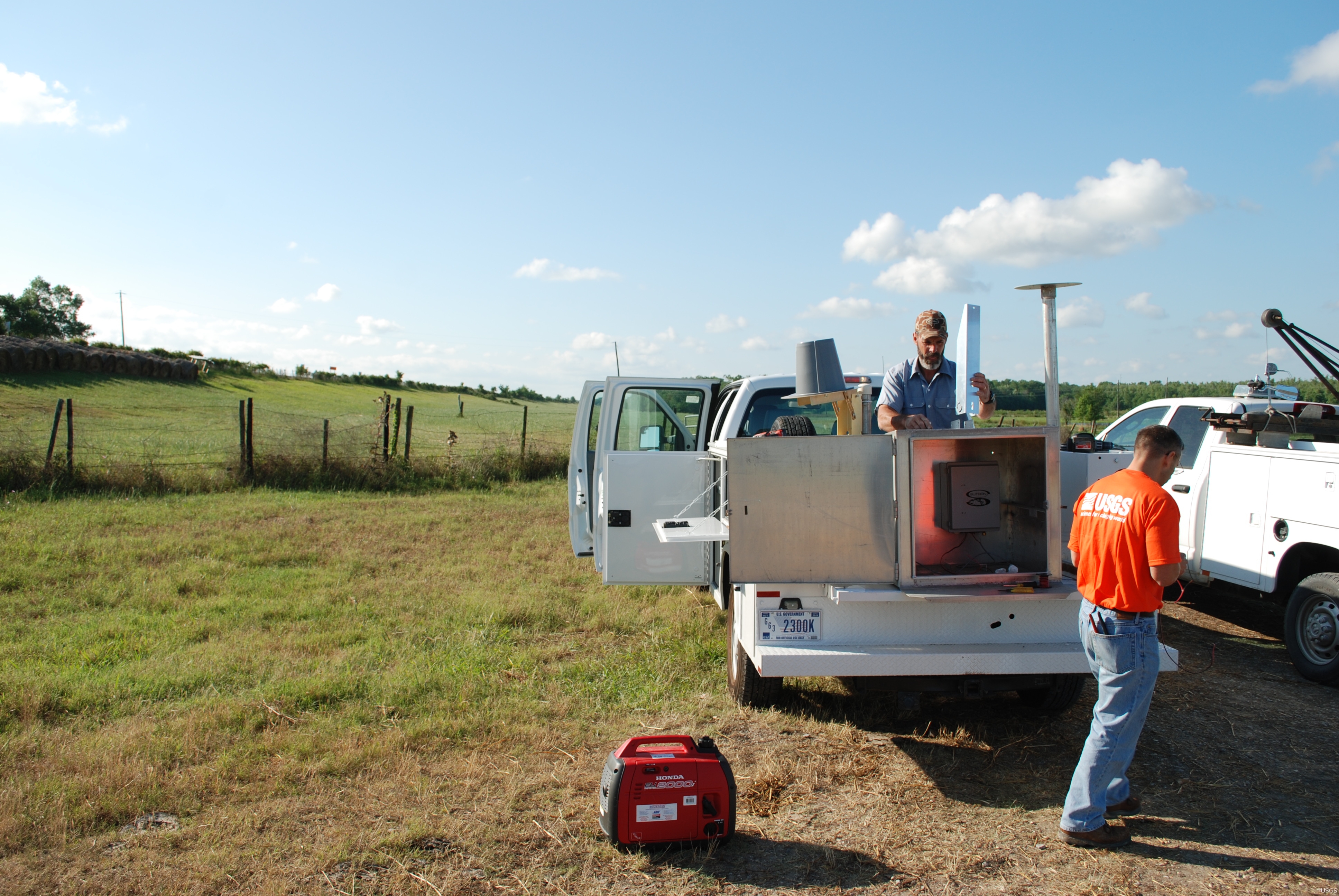 USGS scientists Todd Baumann and Errol Meche install a temporary streamgage to measure water levels above and below the the Morganza Spillway. USGS streamflow information is used by the U.S. Army Corps of Engineers to help them make informed flood management decisions. One floodgate on the Morganza Spillway was opened on May 14, 2011.