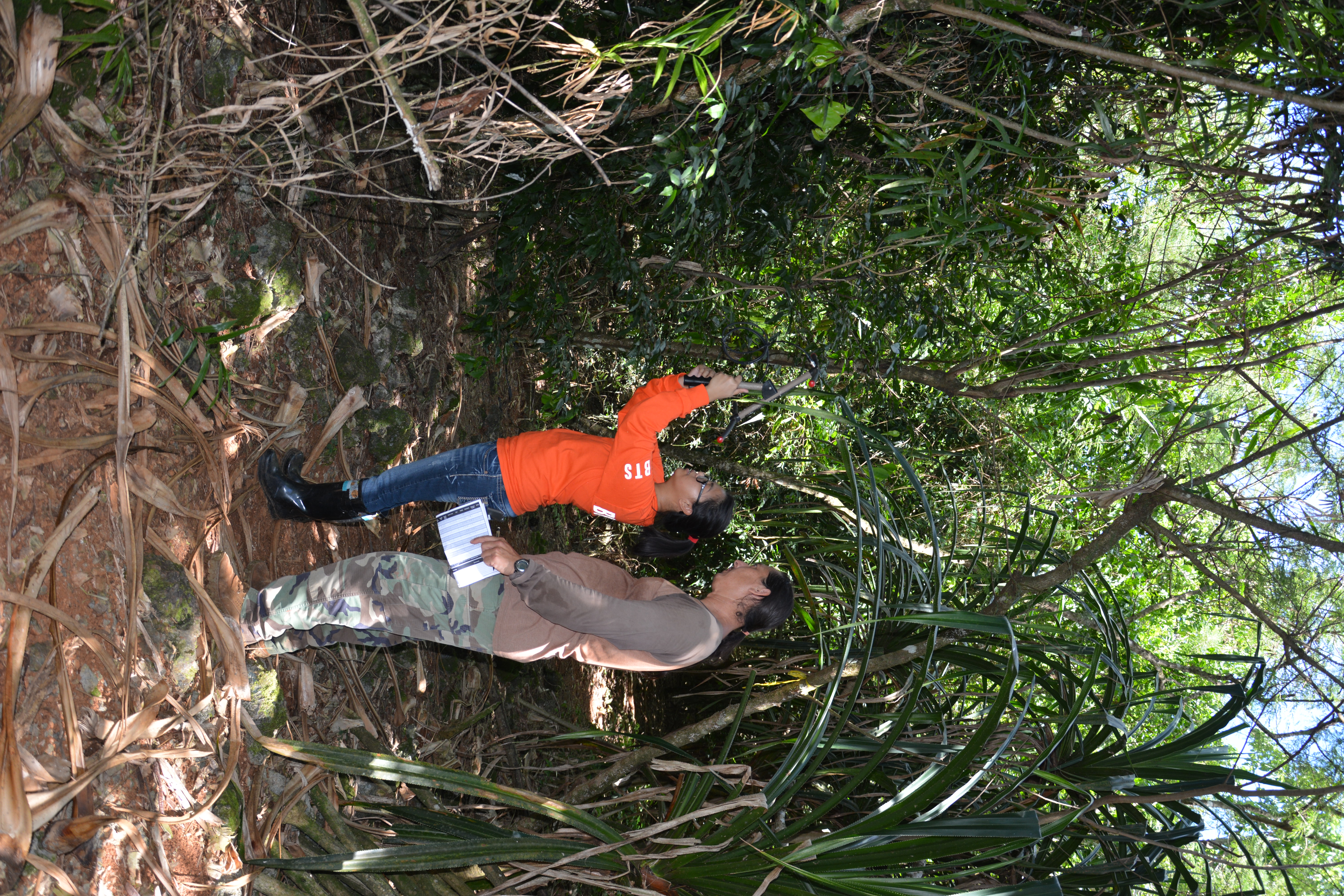 USGS staff Marijoy Viernes and Thomas Hinkle using telemetry equipment to help determine the fates of brown treesnakes following a toxicant application during an experimental eradication led by USGS.
