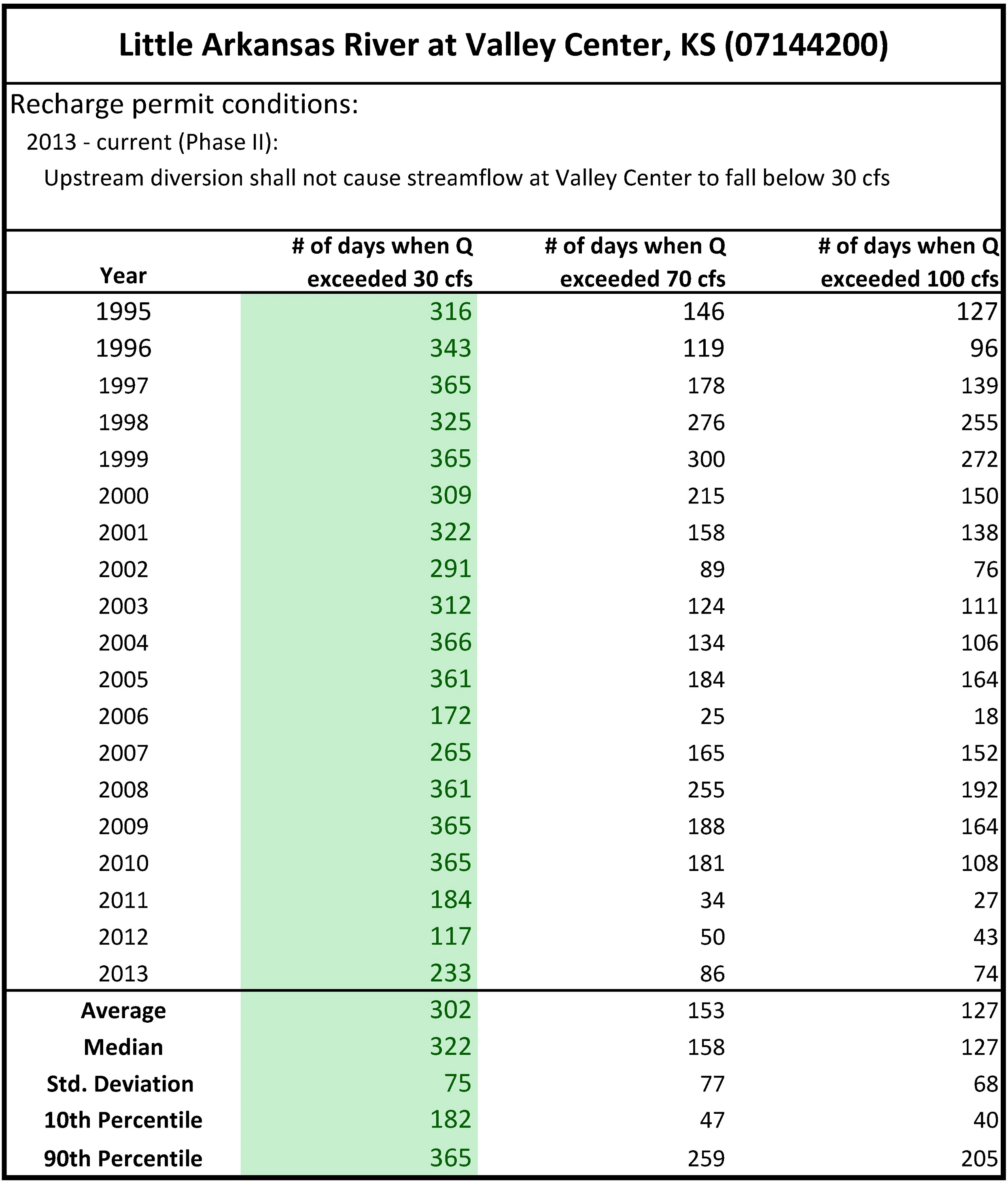 A chart showing the number of days discharge exceeded either 30, 70, or 100 cfs from the Little Arkansas River at Valley Center site from 1995-2013.