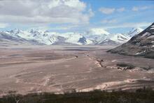 Pyroclastic flow and ash deposits that fill the valley remain nearly vegetation-free more than 100 years after the 1912 Novarupta-Katmai eruption. The rim of Katmai Caldera is on the skyline at left. Origianl photo can be found at: http://www.avo.alaska.edu/images/image.php?id=394
